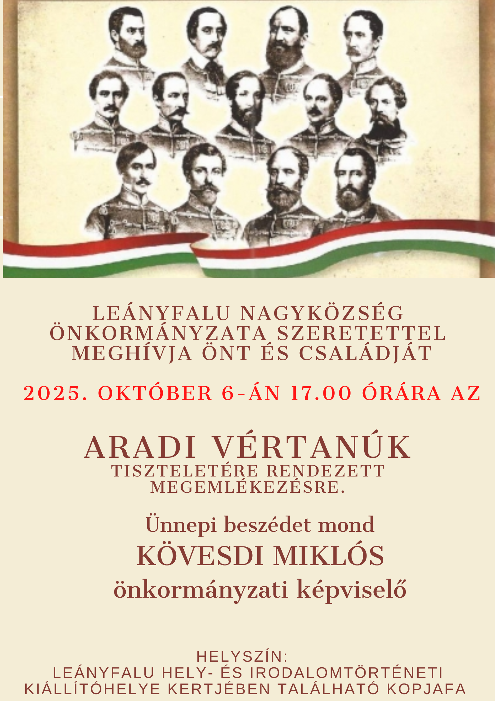 2025. október 6-án hétfőn 17 órára az Aradi Vértanúk tiszteletére rendezett megemlékezésre.